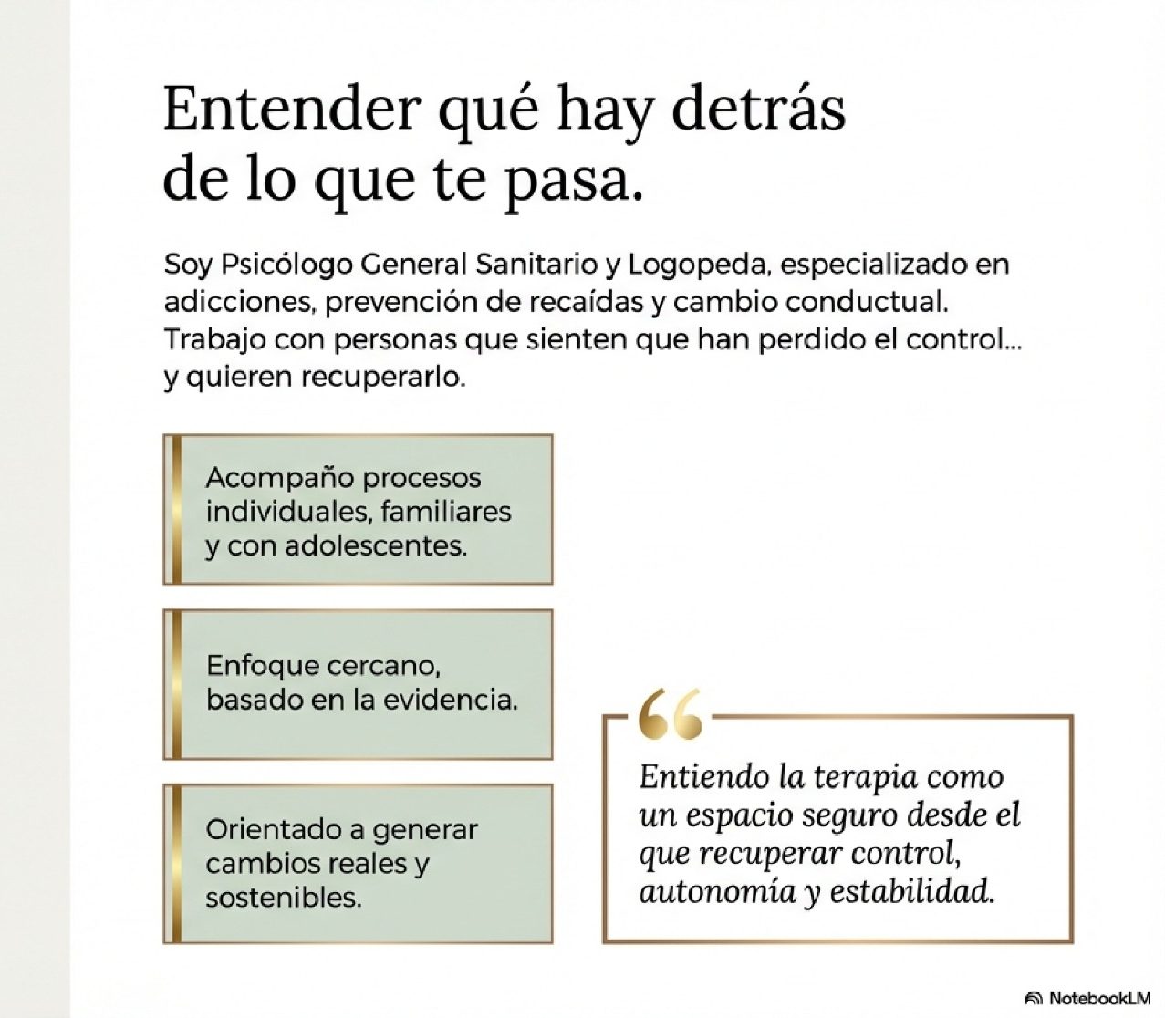 Soy Psicólogo General Sanitario y Logopeda, dedicado a atender personas con adicciones y dificultades comunicativas. Mi misión es ofrecer un trato humano y cercano, entendiendo a cada persona en su singularidad para promover cambios sostenibles y bienestar integral.